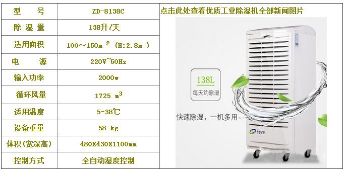 優(yōu)質(zhì)工業(yè)除濕機(jī)適用面積100-150m 2 左右,除濕量為138升/天,廣泛應(yīng)用于醫(yī)院以及生產(chǎn)車間,銀行金庫(kù),檔案資料,圖書館,精密儀器室,貴重物品倉(cāng)庫(kù)等場(chǎng)所。