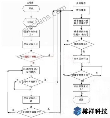 開機后,先進行初始化,包括對單片機的初始化、LCD的初始化和其他模塊的初始化。出于省電的考慮在40s內若沒有鍵按下,讓單片機的LCD控制器進入空閑模式。用“for”循環來計時,并設計初值為零。